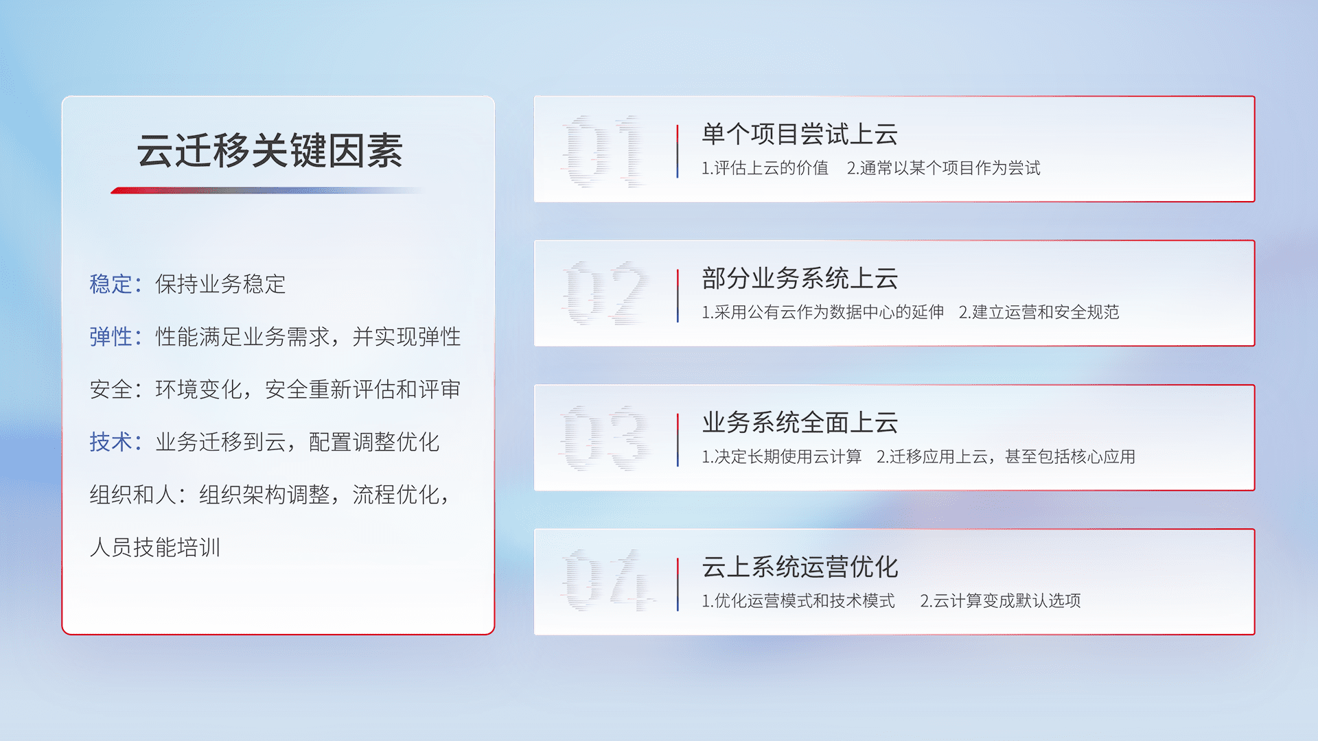 结合实际业务,,,,从规划设计、、、云平台选型、、、云原生改造、、、数据迁移、、集成交付,,迁移全过程为客户识别最佳上云路径,,做好风险识别管理,,,设计网络架构、、、、身份权限、、、、安全审计合规、、操作审计、、日志审计、、、监控告警策略、、、、多站点容灾设计等,,,对云上基础设施进行整体规划,,,,提升IT治理水平,,,以满足弹性、、、高可用、、、、高性能的需求。。。。