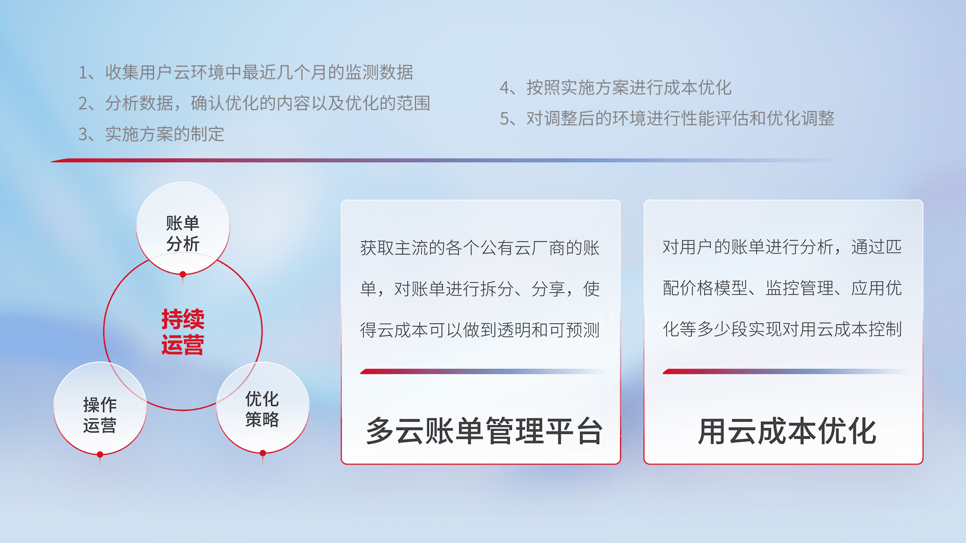 通过多云纳管,,以统一的资源数据模型把客户的云资源进行抽象和封装,,进而实现对多云资源的统一操作,,,保障云资源管理的可靠性、、稳定性与可用性。。量身定制化运维内容,,,,配置、、、开发运维、、、补丁管理、、、备份、、监控、、、认证和访问管理、、审计和日常巡检等,,,保障在用云过程中的可靠度,,,,稳定度以及高可用率。。